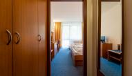 Large, spacious family room with four fixed beds, consisting of 2 separate rooms, each with its own shower and toilet. The room has a TV and WiFi.