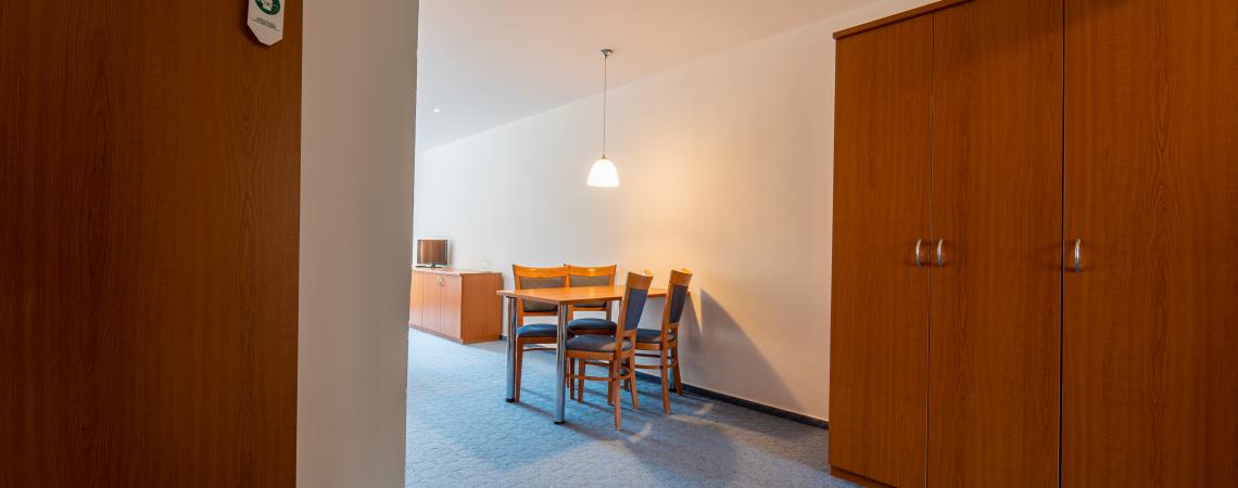 Rodinná izba Comfort má veľkú obývaciu časť s rozkladacím gaučom, TV a Wifi a vlastnú kuchynku. Oddelená spálňa s maželskou posteľou dáva príjemné súkromie po celodenných výletoch do Tatier s rodinou.