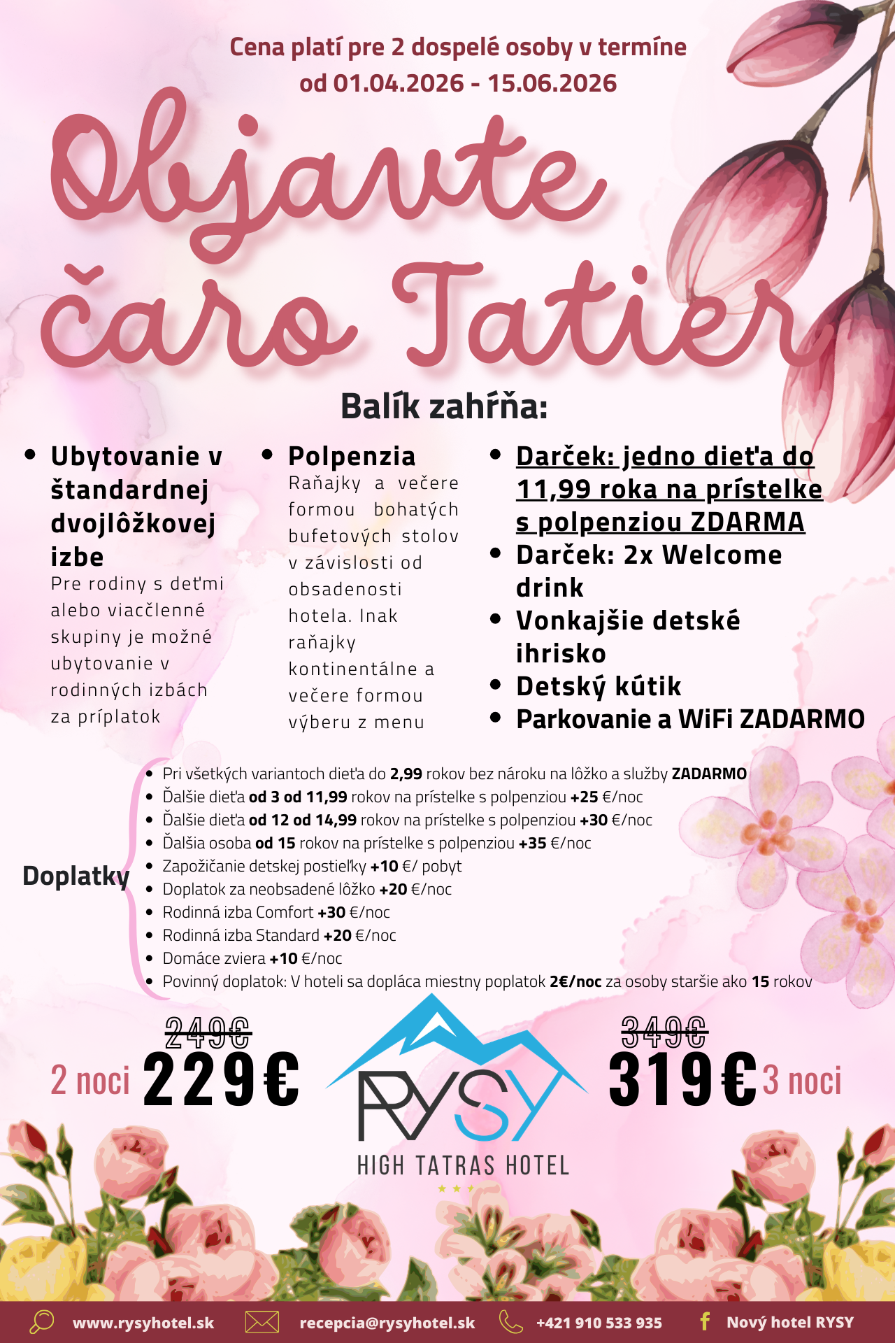 - Ďalšie dieťa od 3 od 11,99 rokov na prístelke s polpenziou +25 €/noc.